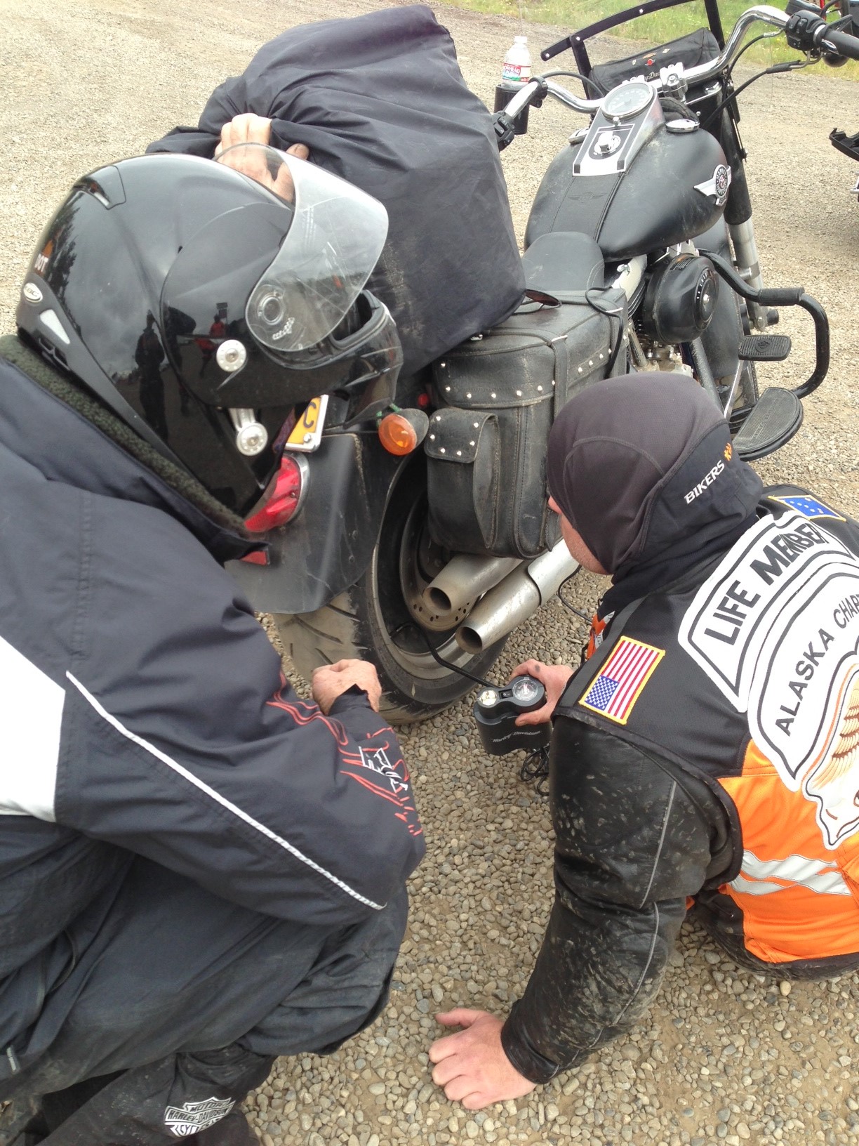 His tire was almost completely flat. The group had a lot of different ideas and opinions on what Lee should do, but after using our handy HD air pump and re-inflating his tire he decided to hit the road and see how far he could make it.