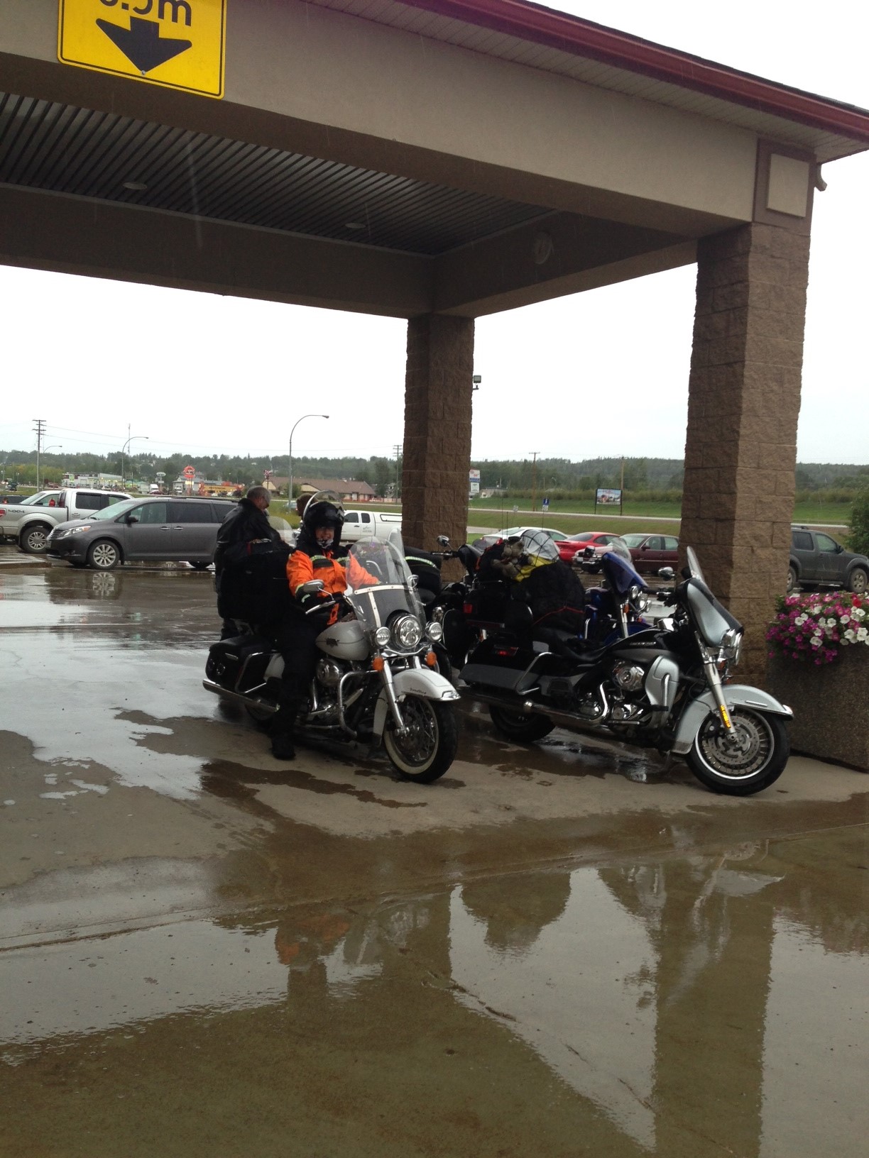 It is getting late here in Gran Prairie we lost another hour, so we are now 2 hours ahead of Alaska time. I can’t believe we have already gone so far! Today we started off in Fort Nelson, in some intense rain, with wind blowing it sideways. Despite the rain, everyone seemed to be in good spirits. We were all ready for the next adventure! Howard Hunt had some Cake music blasting in the lobby from his phone, because we act like we own the place, and Glen Marunde was running around getting everyone pumped for the day. It was probably quite the spectacle from an outsiders perspective. A running joke from my last trip down for the 105th anniversary party, is to yell “Let’s get this freak show on the road.” This is primarily because in 2008 I was traveling with my dad, Paul Ramage and a customer Mike. When we would stop for gas, food etc Paul was always the last one to be ready and on his bike. So, being impatient I would always yell “Let’s get this freak show on the road!” We named our group the “AlCan Freak Show” from that point forward.