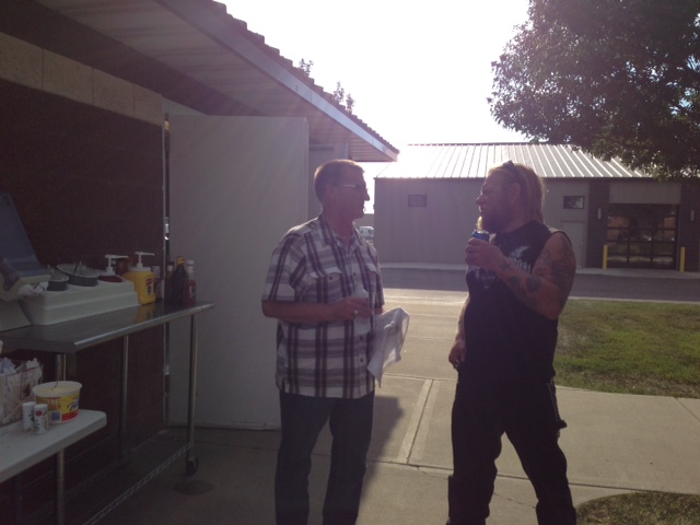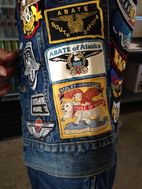 We got back to the shop and others in our group were all gathering. We got quite the spread, steak sandwiches, brats, fresh sweet corn, potato salad and coleslaw! Plus free drinks, we were all very happy and fed. A really cool addition to the party was the surprise appearance by my dad’s old friend Roger. I met Roger and his wife when I was driving with my dad down to South Carolina in 2004 for College. He used to live in Alaska and had bought a bike or two from Barry. A cool old guy with some fun stories from back in the day. He still has some of his original patches on his denim vest from the 70’s and 80’s including a “Barry’s Custom Cycles” patch!