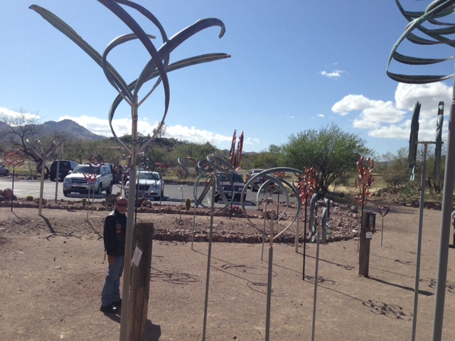 Today we slept in and tried to get on AZ time. Eventually when things warmed up, Barry and Jerry met us at the hotel to head to Arivaca a small town near the Mexico boarder. The ride there as nice and curvey and the wind wasn’t as bad as the day before, but it was a cool wind and 70* temps. We stayed off of the freeway for most of the trip, and were able to take more exciting roads. Apparently Arivaca is a small town that has some interesting inhabitants…. From what Jerry said, there were a lot of wealthy folks who settled down there from all over, but a lot from the west coast. The first stop was at a local coffee roasting place, unfortunately they are only open a couple days a week, so they were closed today. So, of course the next stop was a …BAR! We stopped in at the local Cantina, which literally filled up after we got there. It was interesting to see so many folks drinking in the middle of the day in the middle of the week! From what I hear some of the folks have some special “gardens” they grow in the area, all hearsay but fun to picture all the folks enjoying a drink between cropping their “grow”. 🙂