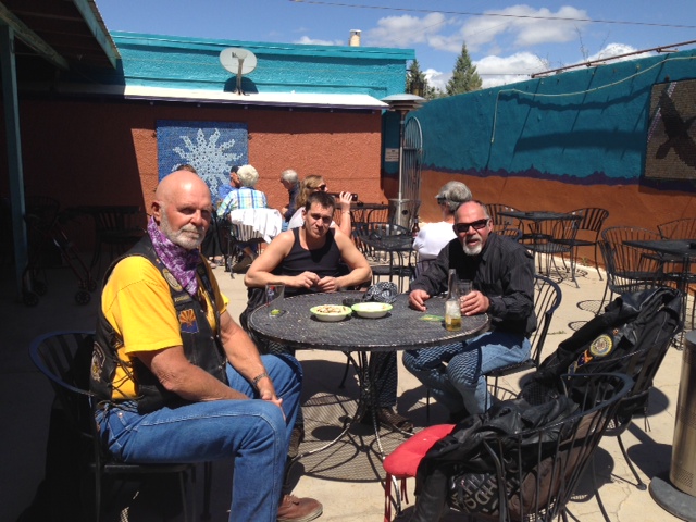 We arrived in Tucson last night and Barry picked us up from the airport. The landing was a little rough, with some pretty strong winds. I made the mistake of continuing to read my book during the approach, and boy was I nauseous. We missed my bag coming down the baggage claim, and were almost the last people to grab our bag…I was too ill to focus. By the time Barry got there to pick us up, I was feeling better and we headed to Jerry’s house to pick up our bikes. We were blessed with a bike for Jon to ride. Our friends Mark and Jan (whom I met on the trip to Mexico) let us borrow their Dyna switchback for Jon to ride. When we arrived to Jerry’s house the bikes were all gassed up and ready to go, thanks to Barry and Jerry! We headed to the hotel with my dad and checked in. He met us back at the hotel bar/restaurant for dinner.