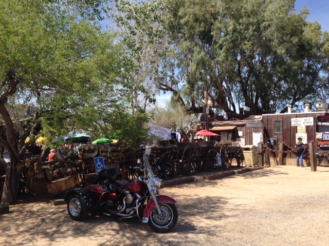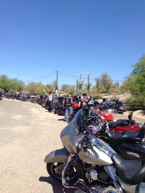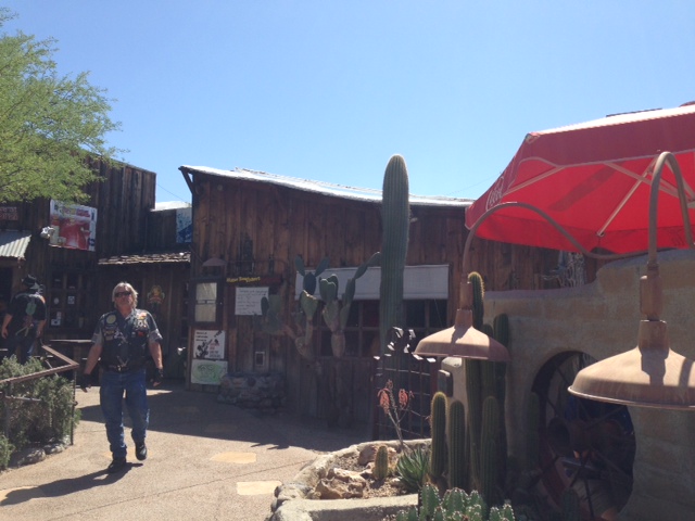 Eventually we all decided we would load up on the bikes and head out to Cave Creek. I hadn’t even heard of this place prior to today, but I am glad we made the trip! It was a pretty drive, not too far, but awesome scenery and some really nice houses up in the mountains, plus some really cool boulders. We drove through Care Free, AZ on our way to Cave Creek. Once we got into Cave Creek we got separated by a few cars between each of the bikes. I guess we were coming in right after a parade, so one side of the street was shut down and traffic was crawling. It was super hot today, so sitting on the bikes going 1mph was getting old quick.