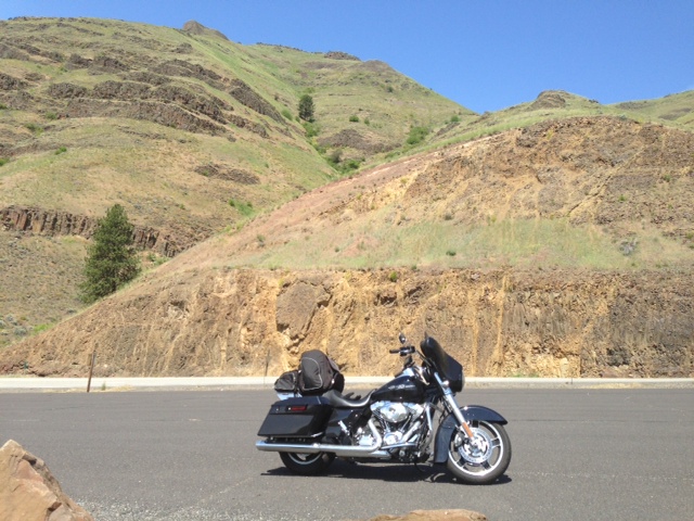 As my routine has become I was up and on the road by 7am. Today my whole route was off the freeway which i was greatly anticipating. My plan was to only go to Lewiston, which would be about 270 miles, an easy day. I put on a lot of layers when I left, the air was cool and I figured it would be a cold morning. I completely underestimated the chill the air would have going through the mountains on the Payette Scenic Byway. The first 40 miles I was freezing. When I couldn’t feel my fingers anymore I pulled into a little cafe on the side of the road. The ride in was beautiful. It was hills and mountains with a fast moving river winding along the side of the road. The sun was still pretty low in the sky and the mountains and trees kept a lot of the road in the shade. When I pulled off my gloves my fingers were completely white. I put my gloves on the top of my primary to heat them. I went inside and drank two cups of hot tea waiting for my hands to gain some color.