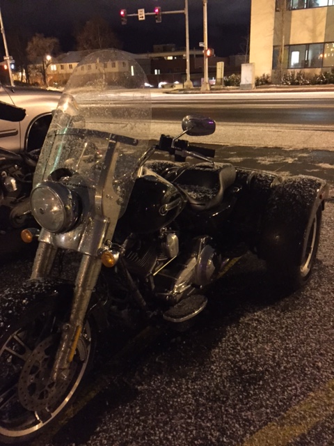 Monday morning several roads were closed and we had something close to 60 accidents in Anchorage because of the snow we had and the icy roads. I stayed home for the morning and did some yoga. I had an appointment to get my hair done at 12:30 and didn’t want to miss that appointment (I have to maintain my bangs) so I jumped in my car and headed down the hill. I was only planning on getting my hair done then heading back home. However, after I made it down from hillside I saw the roads really weren’t that bad. The main ones were pretty much melted. I saw that my riding gear was still in the car from Saturday and decided I wanted to take that trike out again. The Freewheeler handles amazing. I can’t believe how well it corners and how much fun it is to ride. So I called my buddy Ben and asked him to go triking. Of course he was still in bed…at 1:30 in the afternoon, so after he got ready he met up with at the Peanut Farm. We grabbed some lunch and headed to the east side of town. Just a week ago Nich was saying how there are not enough people to ride trikes with, so I guess when he saw Ben and I posting our adventures he decided to join. He met up with us at Cabin Tavern on the east side. By the time we left there it was getting dark and a little icier, the Freewheeler handed great! We headed to downtown then back to the shop. Besides getting coated with slush from my fellow riders I had a blast! Now I am looking forward to getting some more heated gear and extending my Alaska riding season to year round.
