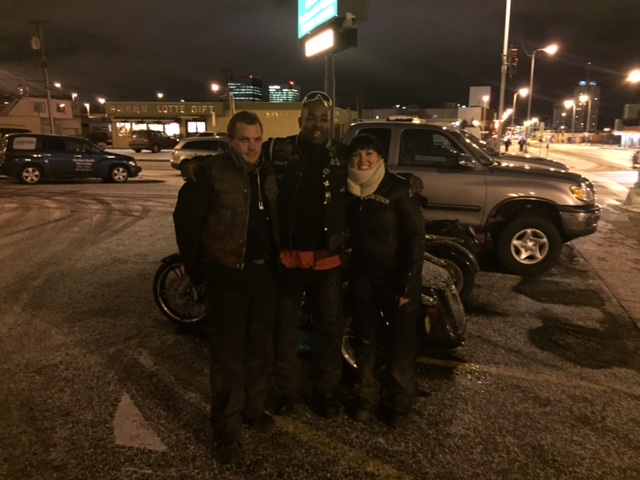 Our new Sales Manager at House of Harley, had this wild idea to do a trike ride on Halloween. From this seed we developed the Trick or Treat Ride to be a poker run to benefit The Downtown Soup Kitchen with a $10 buy in and prizes from House of Harley for the winner. I was in the mood for adventure so I told Sal he and I could go on the trike ride on a couple of used trikes we had. I figured I would borrow the beautiful used Dyna trike with the Frankenstein conversion that we just took in on trade. Well as things go, the trike I was going to ride was sold! Good for business bad for me. So, I thought well I guess I can take the new Freewheeler that is on the floor for a “demo” ride. To be 100% honest I was super nervous for this ride since I had never really ridden a trike more than around the parking lot and then add in the snow! Sarah, our Marketing Director decided to also join on a borrowed trike. I pretty much had no room to be nervous since she is pretty far along in her pregnancy and was hardcore enough to go on the ride!