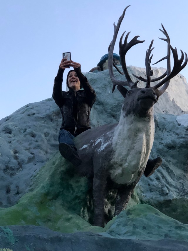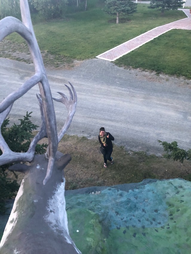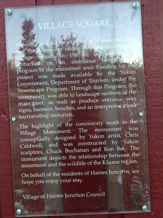 Once I was done with my part, I walked back over to the bar to flirt with the two cute boys working there. I believe it was Ryan and Josh, one was from New Zealand and a little closer to my age while the other one was from the area on only 18 and about to join the Canadian Military. Sarah joined me for a cup of coffee while I finished my wine, and we plotted to do the only fun thing you can do in Haines Junction…climb the ugly sculpture at the cross roads in town. Obviously, I was not going to climb up there, both bum knee and lack of upper body strength, so I got to hold the camera and get some great video and photos of Sarah. The best part of our mission is that the Mounty’s are literally across the street. Sarah…such a rebel. Watching her get down was more entertaining than climbing up, but she made it unscathed and we didn’t get busted by the Mounty’s.