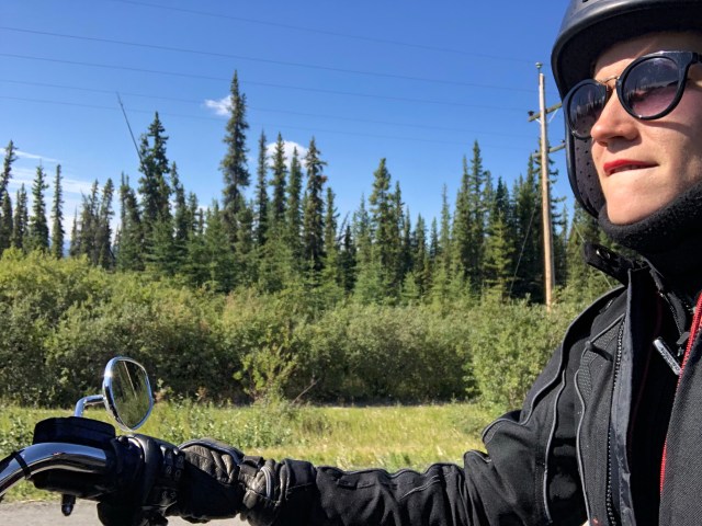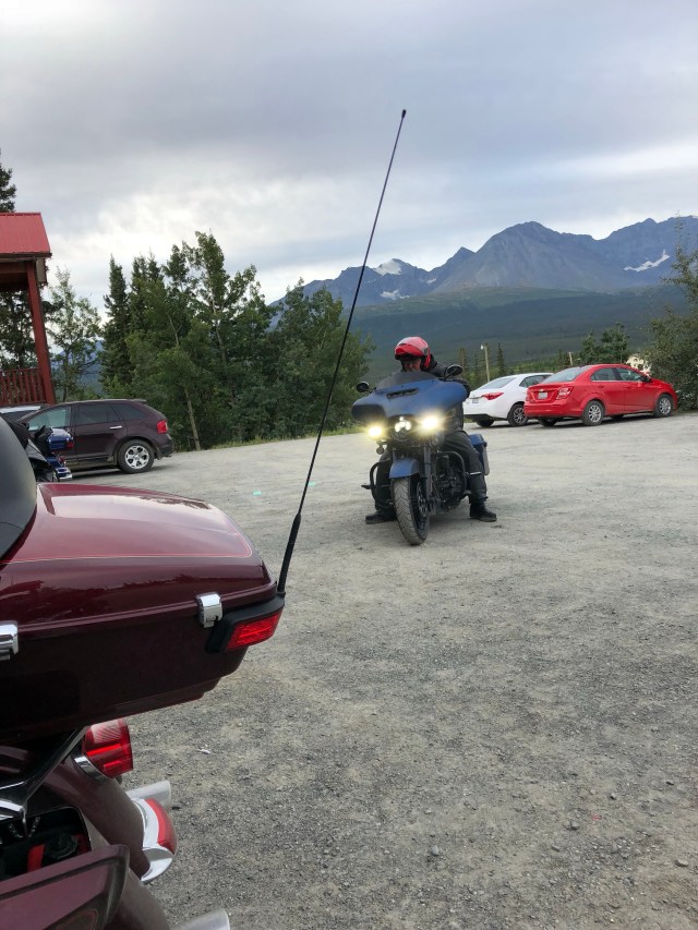 Between Haines Junction and Whitehorse, the road was pretty open and straight. Some big curves but nothing too twisty. At one point we saw that group from the bakery at a truck stop diner, so they clearly got their big greasy breakfast. While we were cruising along I saw a large female moose start to run up toward the road. I wasn’t sure if Jim saw it, but it looked like she might dart behind him and in front of me so I started to slow down. As soon as Sarah and I got closer with our super loud music she turned tail and ran fast back toward the woods she came from. It really is impressive how big and powerful moose are.