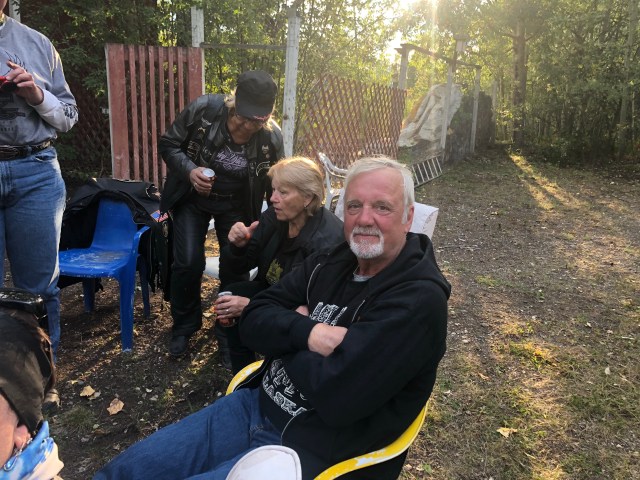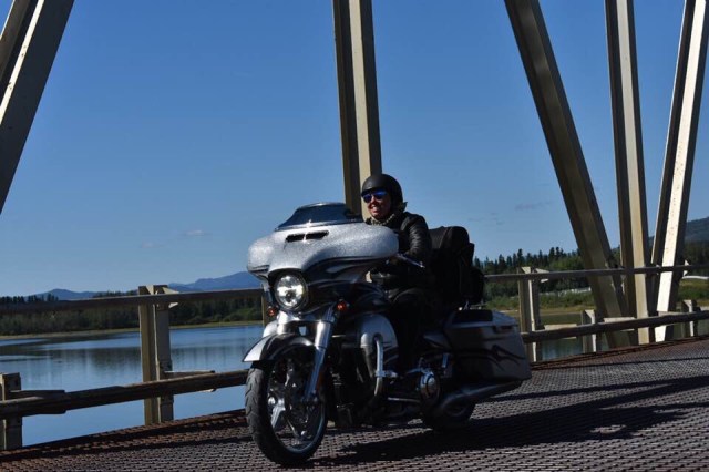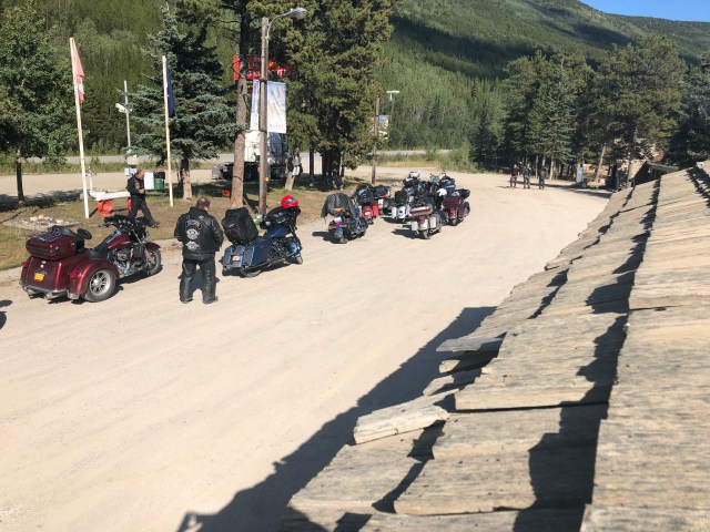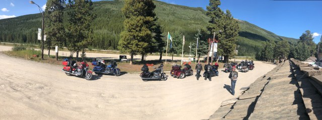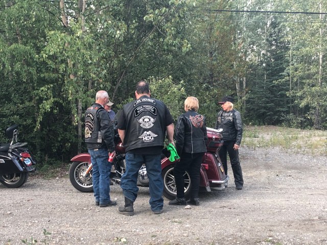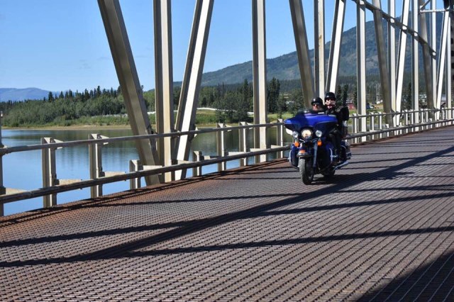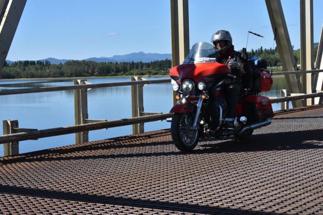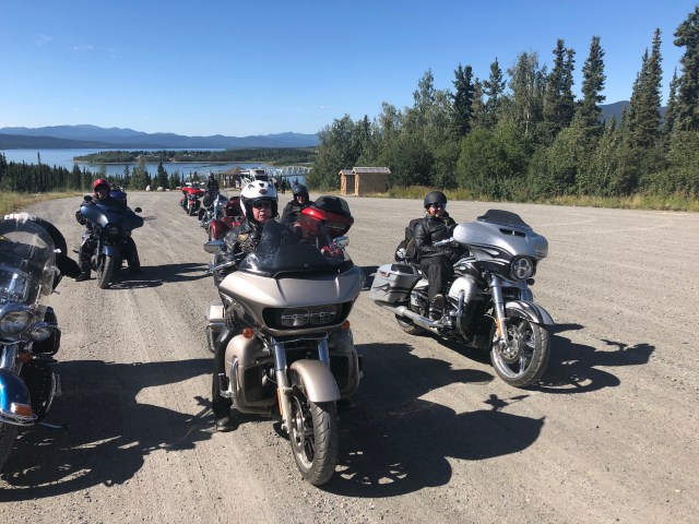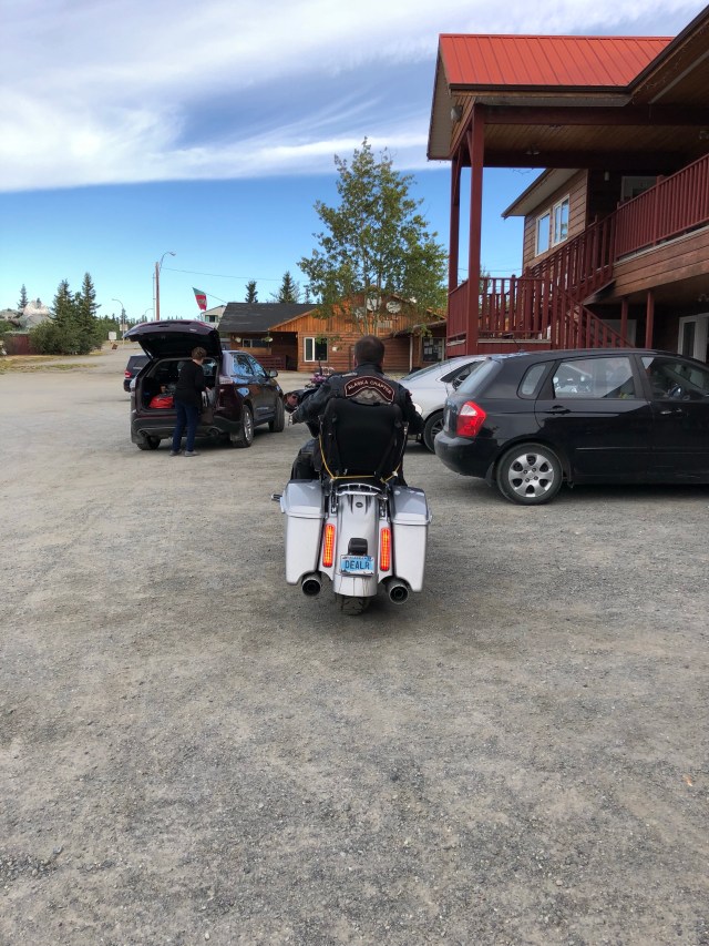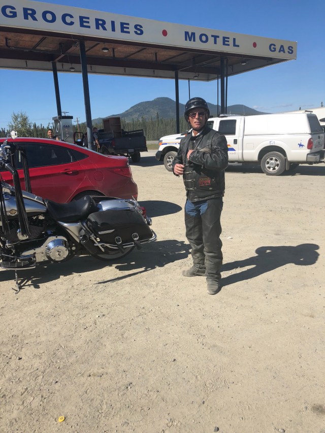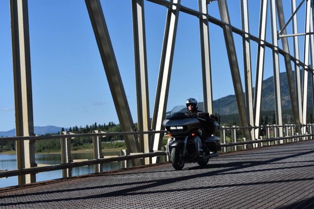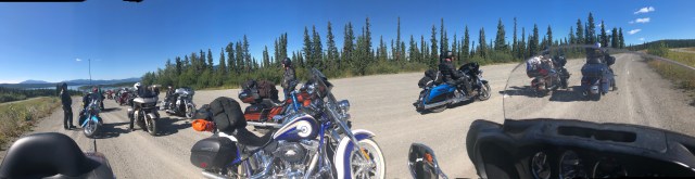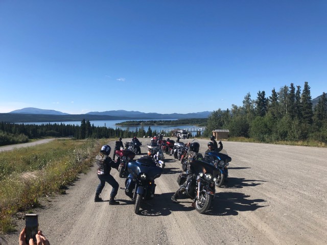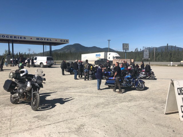 We approached Teslin and I saw the first gas station so I pulled in. As I parked my bike I looked up and I’ll be damned there was our token Canadian Dewey! He had planned on meeting our group in Teslin and I guess I picked the only option. Eventually our entire group got there so we all hung out while they ate ice cream and chatted about the past few days and upcoming adventures. My stomach was in pretty rough shape so I laid on a bench trying to stretch out my stomach. Sarah got some work done and we all enjoyed the beautiful sun. The weather was perfect again today. It was clear and sunny the whole way, just a little cool in the air which is always refreshing. In a few places I could smell smoke, which I assume will only get worse as we get closer to all the fires in B.C. Eventually, everyone was done with their ice cream and catching up, and Dewey wanted to get pictures of all of us coming across the grated bridge. If you are not familiar with these bridges they are an old school metal bridge that feels like your bikes is going to wash out while you ride down it. Dewey crouched at the other end and got a bunch of great photos of all of us riding across. The semi’s started to stack up so I think he may have missed a few people since the truckers were getting impatient with him blocking the bridge. We pulled into a rest area just up the road and waited for him to catch back up. After sitting in the uphill dirt parking lot for awhile we got the train moving. Dewey, Chris, Julie and Gary all took off like bats out of hell so a larger gap developed between John and Glenda Pokrandt and the first pack. I slowed way down so I could create some more distance between all of us so I could set my cruise and not have to yoyo with everyone.