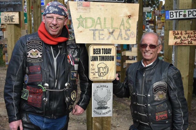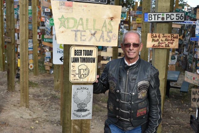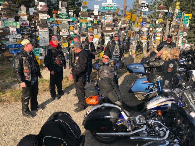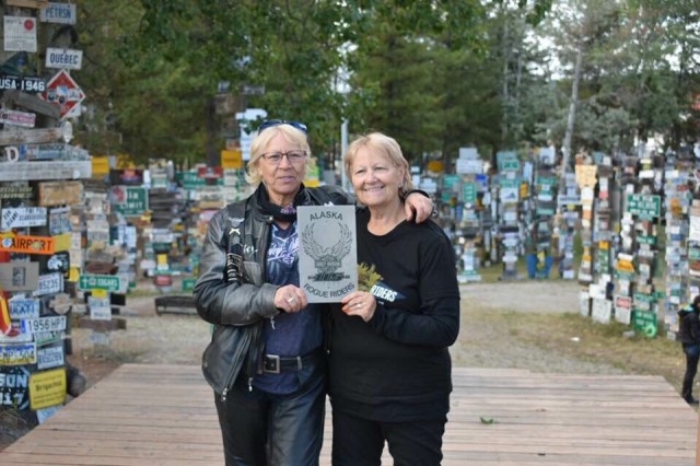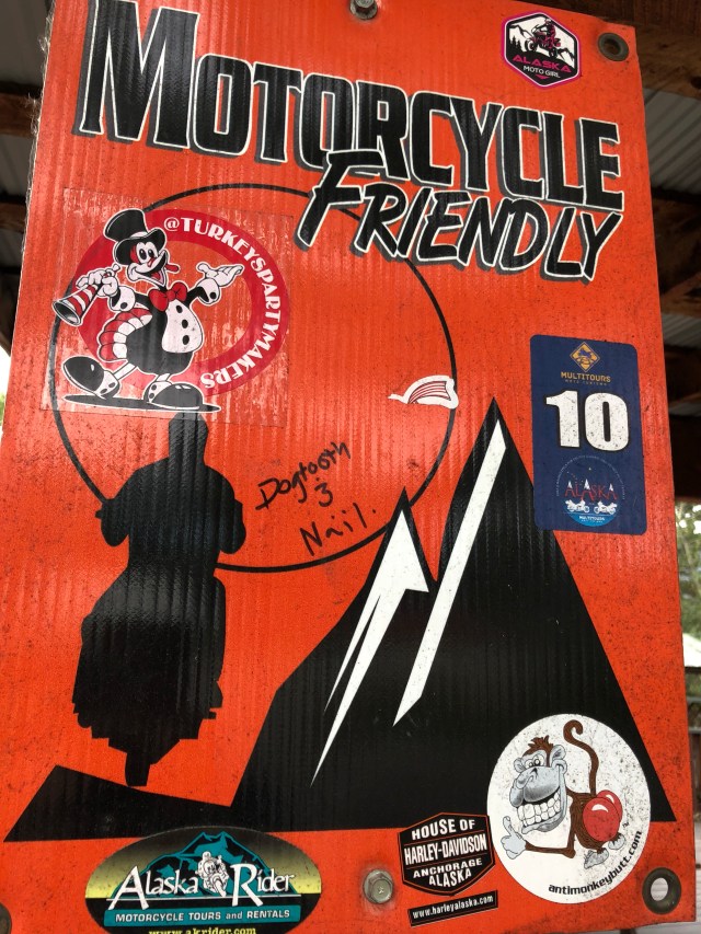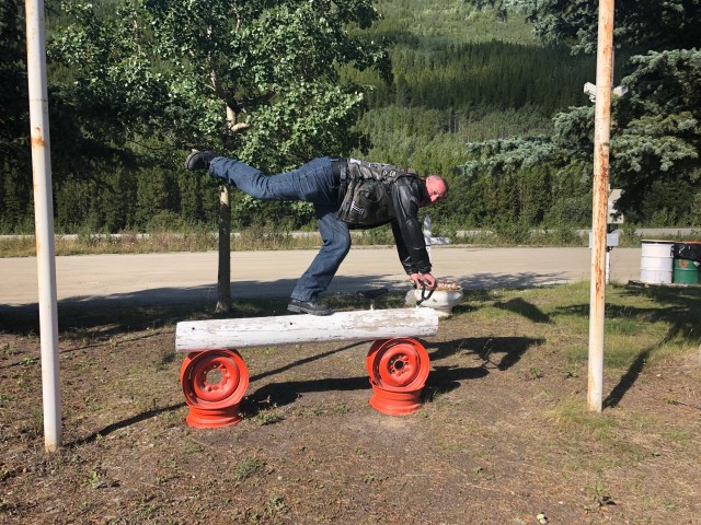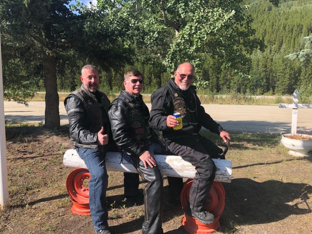 We continued at this pace until we got to Rancheria, which is a small gas station with a restaurant and bar. Last time we came through here, this is where Dewey had met us with us. At this point I was feeling pretty sick so I wandered over to a bench to try and relax. It sounded like everyone was having fun climbing on the log motorcycles and things they had throughout the yard. Eventually we all mounted back on the bikes and headed to Watson Lake and the Sign Post Forrest. Diana Chase had a really cool metal Rogue Rider sign made for us, so after some group photos they found a perfect spot to hang it on one of the new posts that had been put up for more signs. If you have never stopped at the Sign Forest it is really a spectacle and worth taking some time to wander around and see all the amazing signs and license plates from all over the world.