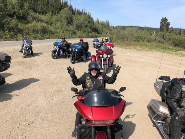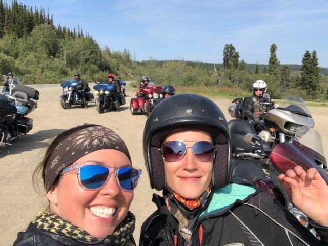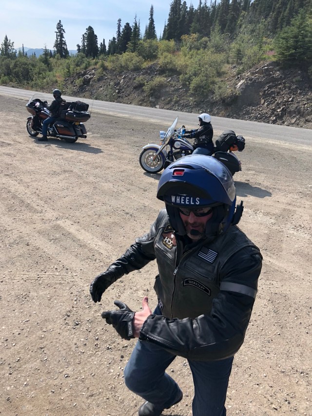 The Cassiar and all of its glory for the first 200 miles has no center line and no shoulder! It was a great road and we all were bombing along taking up the whole road except for when a random vehicle was going the opposite direction. Basically, we rode hard until we caught up with the rest of the group and they pulled into a pull off. I almost blasted by but wasn’t sure why everyone stopped so I followed suit. We pulled into the rest area and it had only been about 40 miles from Watson Lake so as we sat here Sarah and I immediately decided we should just roll out in front of the group and ride our own ride. We threatened to leave Barry and Jim but they got their shit on quickly and we headed out. It was nice to be in front and haul some ass.