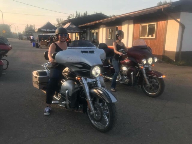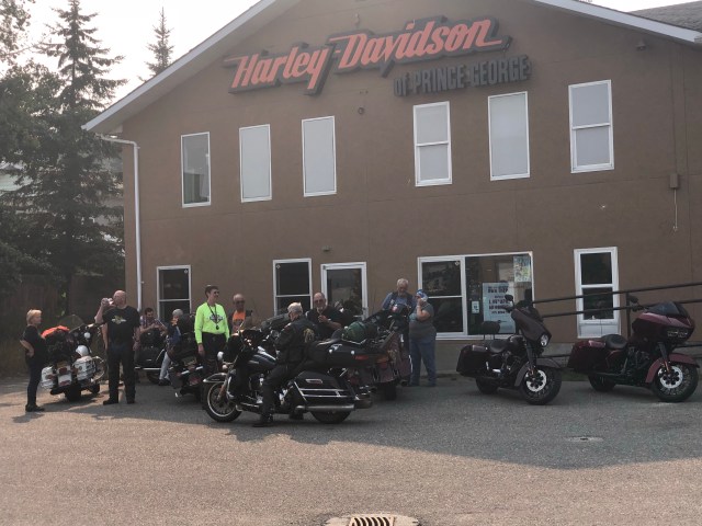 When we got to Prince George we rolled up to the Harley dealership there and enjoyed the AC. In the morning it was super cold, but by the afternoon it was hot and muggy. We wandered through the store and I found an adorable army green leather jacket that fit perfect. I actually bought an army green leather jacket, that I still have, at the 105th. So, I bought that and added it to my collection. I am definitely going to have to mail some gear home when I get back to stateside.