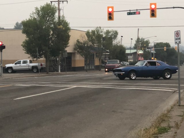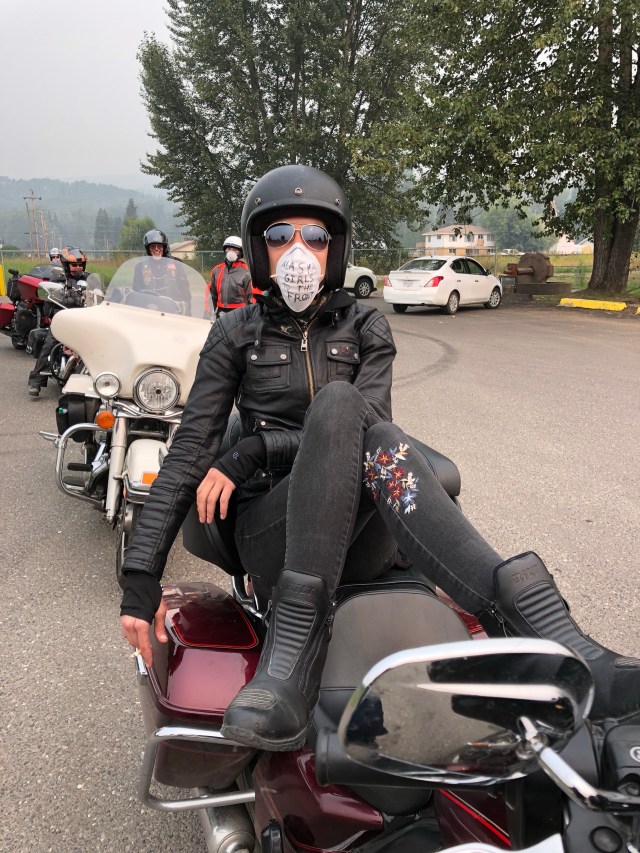 After we finished our drinks we headed back to the hotel. As we pulled into the driveway of the hotel, the rest of the group was getting ready to head out. I didn’t see Barry and Jim, so I thought maybe they left us! We got back to the room and got all our shit loaded on the bikes. While we were getting packed up, Sarah ran to drop our keys off and ran into Barry and Jim. They thought we had left them, but thankfully we reconnected. So, our group today was myself in the lead, then Sarah behind me, then Patti then Cheryl our Canadian friend and then the boys (Barry and Jim) bringing up the rear. Sarah put “Alaska Girls to the Front” on her face mask and Patti had a little pig nose on hers. Today, we were going to be riding through the worst of the smoke. Chris had bought us masks yesterday so we all had something to filter the air. I decided I would rather just risk the smoke inhalation because the mask was hot and uncomfortable. I did get a kick out of Sarah wearing a mask for the smoke, then pulling the mask down and lighting a cigarette at one of the stops.