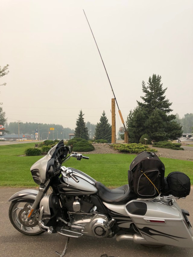 While I was cruising along, we rolled through a town and I saw Dewey waving us into a parking lot. We pulled in, parked and after a few minutes of sitting there trying to figure out why we were there, I saw the giant fly-fishing rod. Apparently, the Canadians are very proud of this “world’s largest fly fishing rod.” We let the group head out before our smaller group and decided we would stop for gas in Burns Lake. I was supposed to get gas this morning with the gals, but I forgot. We all had enough to get us there, so onward we went. When we rolled into Burns Lake we were in the peak of the smoke and there was the rest of the group at the gas station when we pulled into town. Barry and Jim headed up the road to the Chevron while Sarah and I filled up with everyone else. We headed up to Chevron and got passed by the group. After that stop we caught up to a large part of the group, so when the opportunity came up, I passed all the trucks and the group. Oops..sorry not sorry. We hauled ass for a bit, but it was just myself, Sarah and Patti, we had lost the rest of our group amongst the other group. The rest of the way was pretty mellow and was more traffic and some construction.