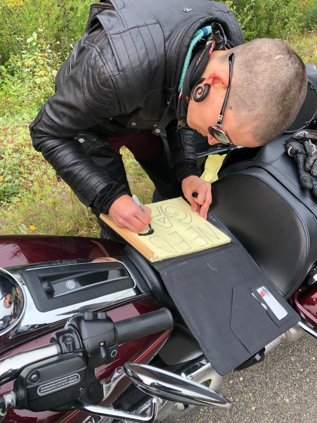 We headed out with the plan to make it until Sarah ran out then we would stop. Eventually, Sarah had dropped off and wasn’t behind me and Barry stopped with her so Jim and I turned around and pulled over with Sarah and Barry. Despite the disappointment of being on the side of the road, we were all ok and together. Sarah immediately started making signs that read “NEED GAS.”