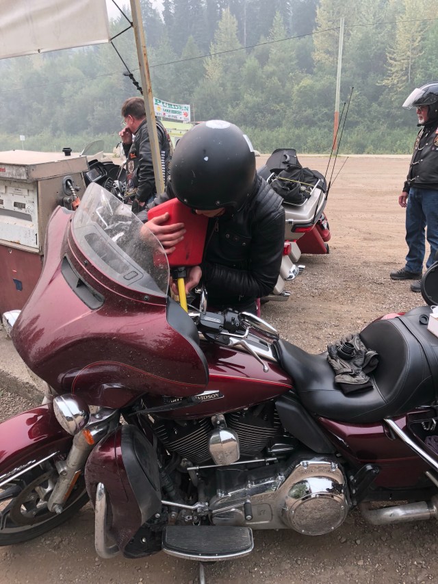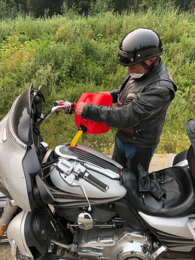 A lot of really nice Canadians stopped to try and help but none of them had gas. One biker, who was riding a 2007 FLHX in Pewter Denim, the exact same bike I made my first trip down the Alcan on, had a large gas can on his bike but it was empty. He was from Edmonton, so he was on his way home. He took the can off and gave it to us so we could get it full enough to get all of us back to town.