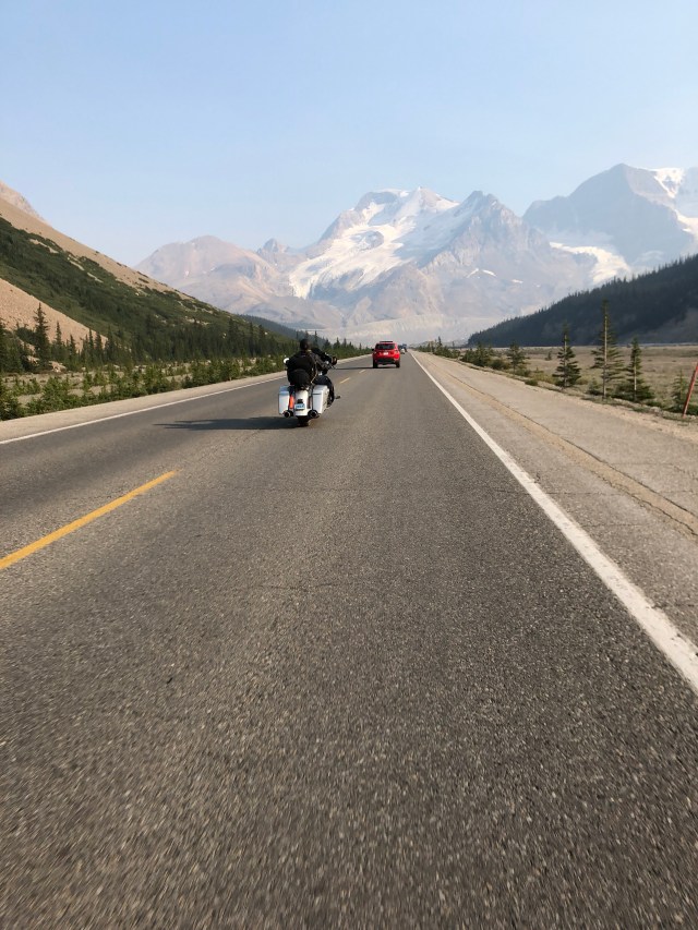 We headed toward Jasper and eventually caught up with the group. When we got to the park, I was in front, we passed the group when they stopped for an “ABC’s of Touring” photo for HOG. We got to the park gate and I bought two passes to get us all through after some counting, recounting and figuring out there were 2 riders with passes already and some random couple that had snuck into our group. Once we had all that sorted we were able to get everyone covered with 2 passes. When we got close to Jasper, I realized it was a right turn toward Banff and a left turn to Jasper. I waved Dewey up so he could lead, as I was pretty sure we were supposed to go into Jasper. As I suspected he turned left so we all went into town to get gas. While we were stopped, I was doing the math on how much farther we had to go. So, Sarah and I ate some snacks and agreed we wanted to keep riding. Jim wanted to stay there with a large group of the riders to eat, so Barry, Patti, Sarah and myself decided to hit the road. We gave the second park pass to Dewey to get the rest of the group through although there were now 8 of them and only 4 of us. Not my circus, not my monkeys…one of them might have to pay for a pass. I lead our group and it was some of the best scenery of the trip. The mountains although still slightly shrouded by smoke were magnificent. I was in Banff a year and a half ago during the winter and summer is a dramatic difference. The road was curvy but not too technical. Pretty much everyone was breaking the speed limit so we kept up with the faster cars and passed the slower ones. It was still breathtaking and beautiful. If I wasn’t leading we probably would have stopped for some photos, but its me, and when I am heading to a destination I take mental pictures of the cool scenery and enjoy it from my bike. There was a super cool looking glass walkway overlook that was crowded with tourists, but we just kept on.