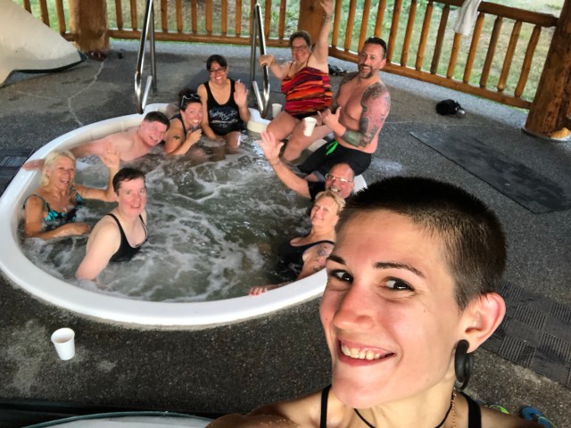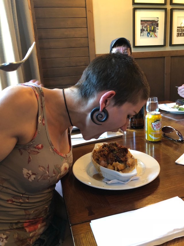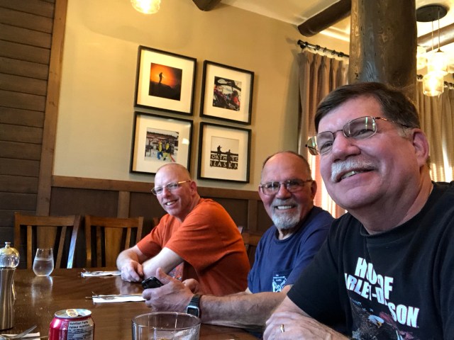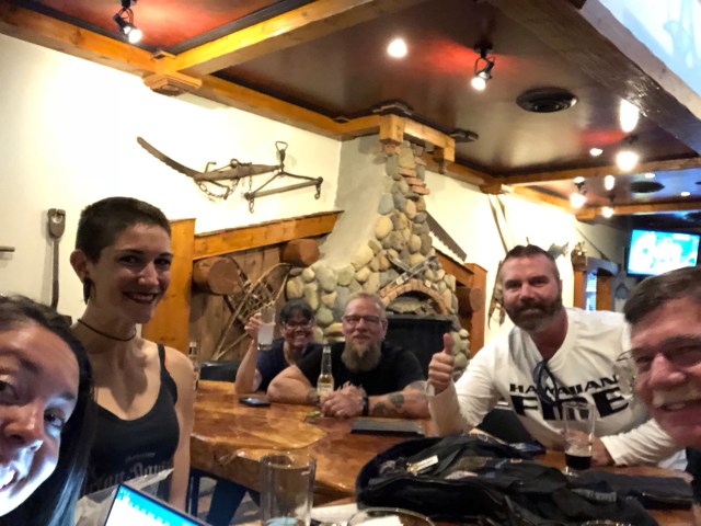 After we got our shit unloaded and Patti’s stuff in our room till her roommates showed up, we decided to go to dinner in town. We were all going to ride, but Barry missed that memo so he walked out in his walking clothes so we all agreed to walk. Patti and Chris parked their bikes in the garage and we all walked to town. The restaurant I picked was closed, so we headed back to the main street and went to Park Distillery. I had a tasting of their different liquors when I was here with my girl Shawna for the winter trip I won from Harley. They did not disappoint and we all had some good food and a few of us some good drinks. Jim walked over and met us and had dessert and Gary walked over a little earlier and had a beer with us. We got to sit outside and enjoy the rapid dusk to evening light change and the cooling air.