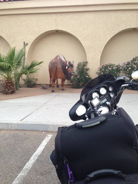 I put ona white long sleeve while I was there since the sun was still high enough to burn me. I headed north, still on the freeway toward Casa Grande. It was still pretty hot and I was considering stopping for the day. I saw a couple bikes parked at the Holiday Inn, so I stopped to chat with the guy still unloading his bike while I looked up the distance to another town. He was riding from California to Texas and seemed to be pretty interested in the amount of bikers from the north that keep bikes in the south….clearly it is because of our winters, but I guess in CA it is always so nice they just don’t understand. It was nice talking to him, he thought I was pretty “ballsy” for taking this trip alone. I agreed 🙂
